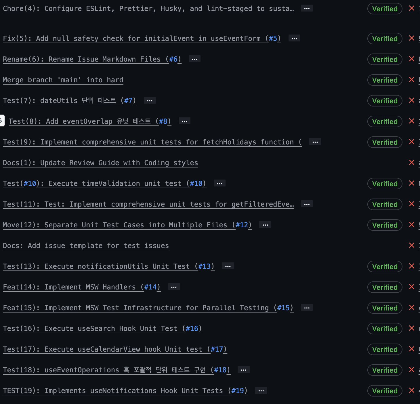 제 과제 흐름을 정리할 수 있었고, 이렇게 만든 이슈를 기반으로 branch를 생성 => 포크한 repository의 hard 브랜치로 Squash Merge를 진행하며, 정말 깔끔한 커밋 이력을 남길 수 있었거든요. 물론 개별 커밋을 확인하기 위해서는, 화면을 2번 이동해야 한다는 1개의 추가 depth가 생겼지만, 저는 이 부분을 문서화로 풀어냈습니다.