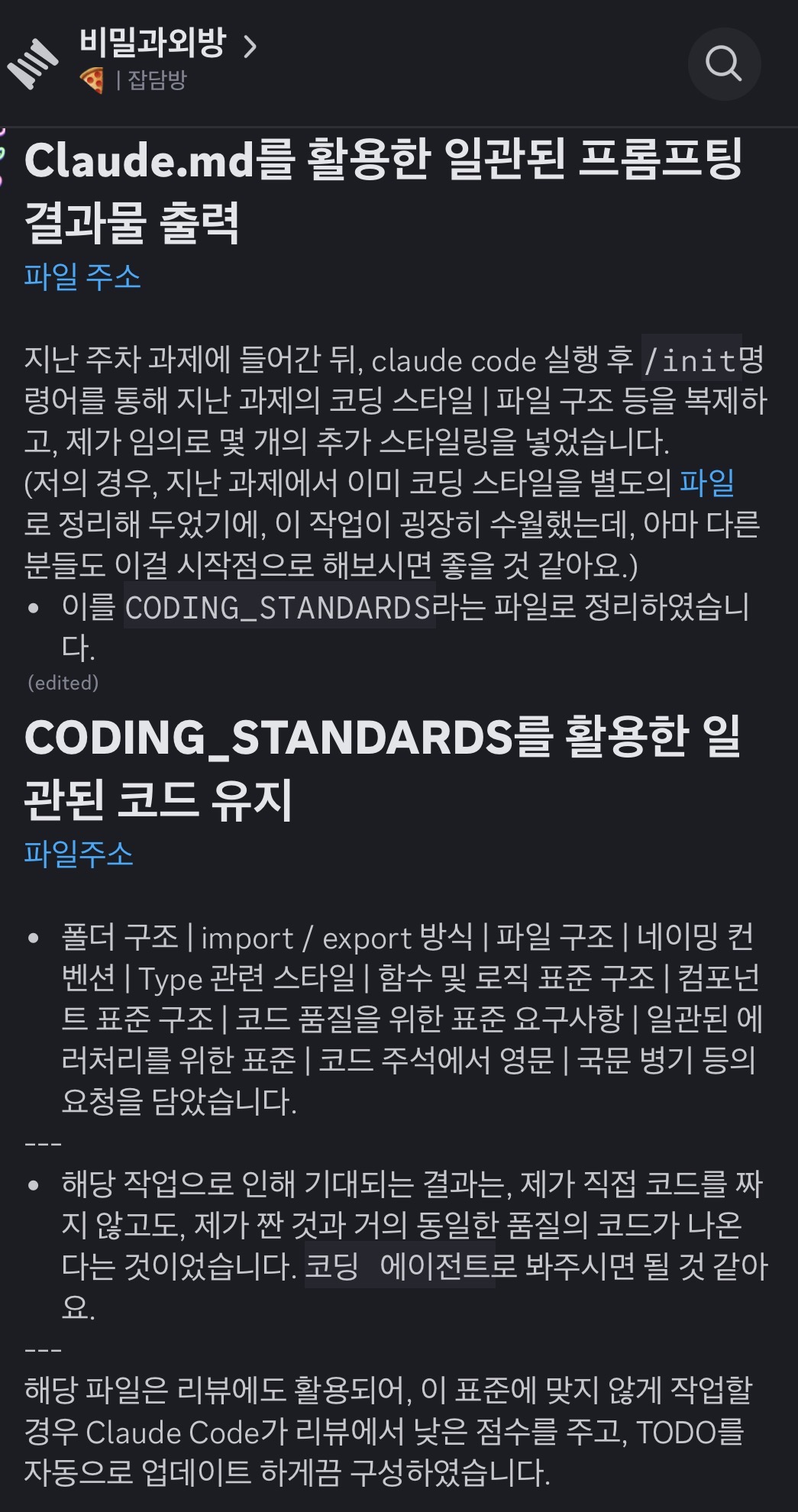 미리 작성해둔 코딩 방식, 개발 프로세스 등을 기반으로 하여 CLAUDE.md를 활용하는 방식이었습니다.