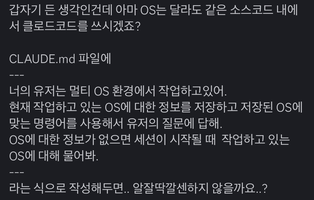 이건 저희 잡담방에 올라온건데요.. Windows, Mac을 번갈아 사용하는 경우, Claude Code가 이전 OS의 명령어를 입력하여 에러가 나는 경우가 있다고 하시더군유,, 저는 맥 + WSL 환경에서만 활용해보아서 상상도 못한 부분이었는데 이렇게 또 새로운 것을 배웠습니다.